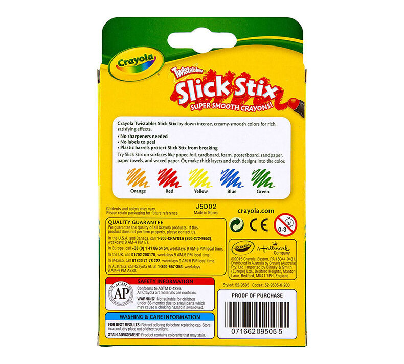 A simple twisting motion of the barrel advances the stick eliminating the need for sharpening and label peeling. Wood Safe for Ages 3. Crayola-This pack of 5 twistable slick six markers includes.